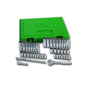 44 piece set is made in the U.S.A., featuring SK's high polish SuperKrome finish, which protects the tools from the harsh working environments found in today's workplace. Provides long life and maximum corrosion resistance. All sockets feature SK's patented SureGrip hex design, which drives the side of the fastener, not the corner, to avoid edge breakage which can occur on rusted or damaged fasteners when a traditional straight cornered hex tool is used. Set includes: 4.5" Pro Ratchet; 2", 6" Extensions; 3/16", 7/32", 1/4", 9/32", 5/16", 11/32" 3/8", 7/16", 1/2", 9/16" Standard Sockets; 1/4", 9/32", 5/16", 11/32", 3/8", 7/16", 1/2", 9/16" Deep Sockets; 4mm, 5mm, 5.5mm, 6mm, 7mm, 8mm, 9mm, 10mm, 11mm, 12mm, 13mm, 14mm, 15mm Standard Sockets; 6mm, 7mm, 8mm, 9mm, 10mm, 11mm, 12mm, 13mm, 14mm, 15mm Deep Sockets.